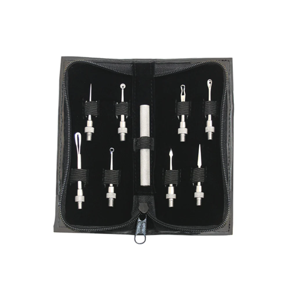 Convenient tool kit comes in a zippered, felt-lined pouch and is ideal for an esthetician or skincare professional. Includes a non-slip, double-sided handle and the following stainless steel attachments for various skincare treatments: